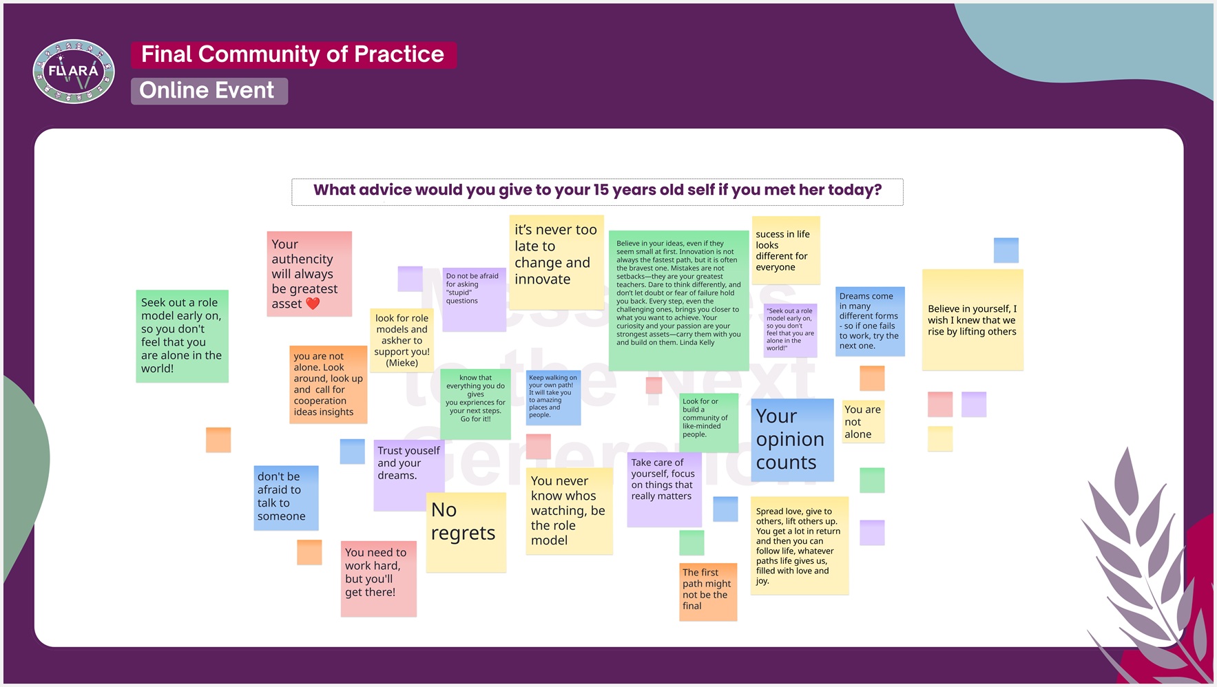 The event also included an interactive moment where ambassadors and project partners contributed messages for the next generation of rural women innovators to a collective digital board. The messages will form part of FLIARA’s final collection of stories and reflections.