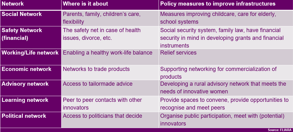 Social networks address the organisation of childcare, schooling, and care for the elderly — essential conditions for women’s participation in community and business life. Examples include extended parental leave, accessible preschool care, and rural school maintenance in countries such as Sweden and Czechia.